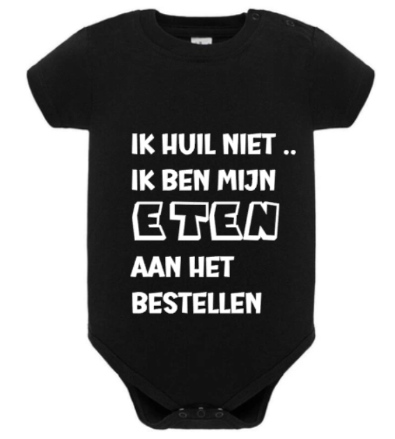 Dit zwarte rompertje met de tekst “Ik huil niet, ik ben mijn eten aan het bestellen” is een echte eyecatcher.