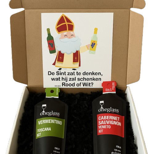 Op zoek naar een origineel én smaakvol Sinterklaascadeau? Dit feestelijke brievenbusdoosje met twee stijlvolle Oneglass wijnverpakkingen is een gegarandeerde verrassing. In het doosje vind je zowel een verfijnde Vermentino witte wijn als een krachtige Cabernet Sauvignon rode wijn – ideaal voor iedereen die houdt van een goede borrel.