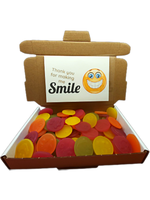 Het pakketje bevat "Smiley" Snoepjes en een leuke wenskaart met uw persoonlijke boodschap.
